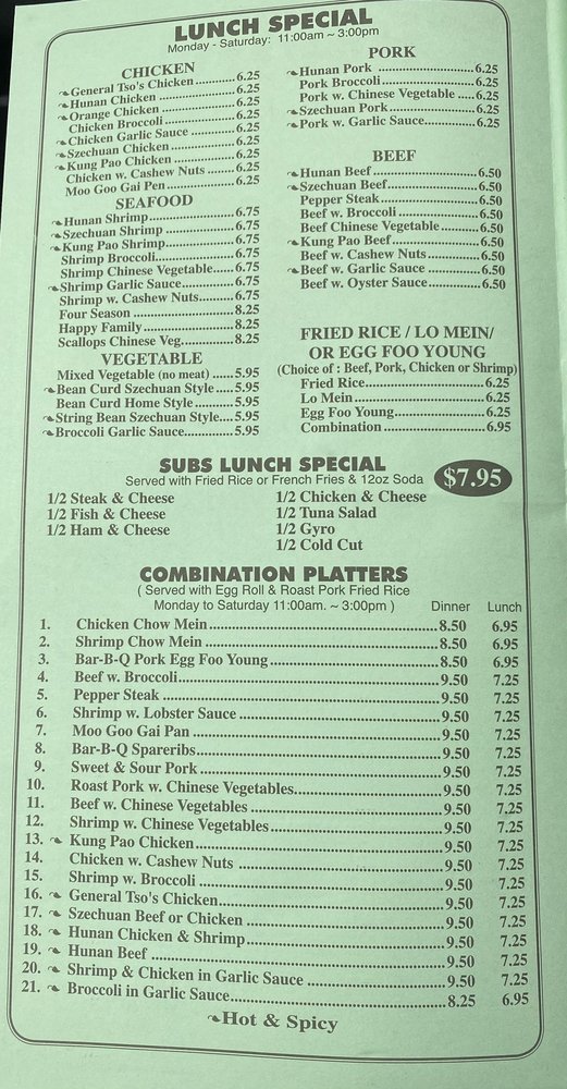 Hearty’s Chinese Restaurant, located in Laurel, MD, offers a variety of lunch specials ranging from seafood to vegetables to chicken. Customers rave about the flavorful dishes such as General Tso's Chicken and Shrimp & Broccoli. The restaurant may not be visually appealing, but the food speaks for itself with fresh ingredients and generous portions. The combination lo mein and veggie fried rice are highly recommended for their balance of flavors and freshness. Dessert lovers will appreciate the old-school fried apple pies. Despite the need for a makeover, Hearty’s delivers quick service and delicious Chinese cuisine. Give them a try for a satisfying meal that won't disappoint.